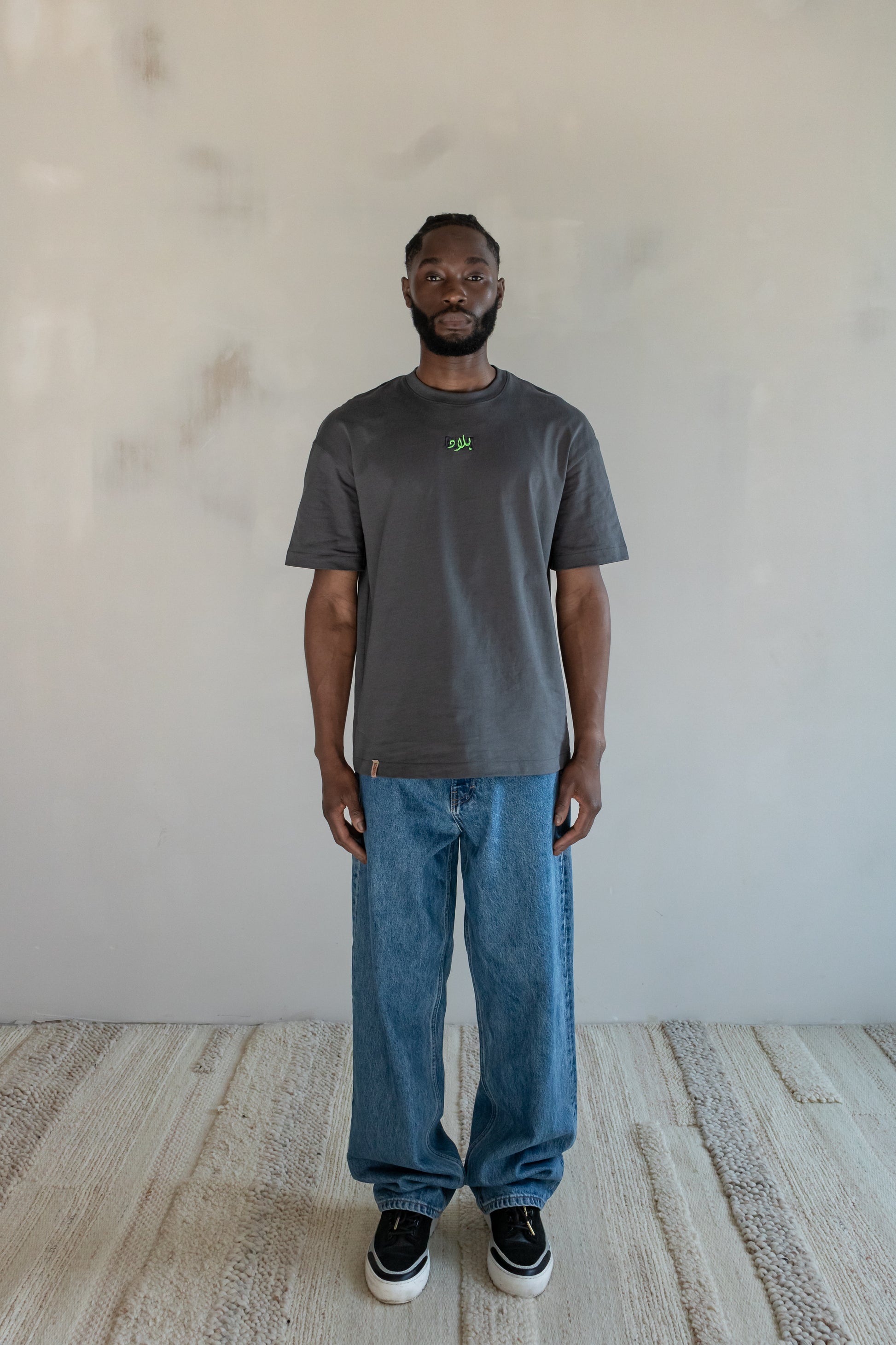 Crafted from 100% organic cotton in a rich iron grey, this design features "BLED" embroidered in dark grey, layered with its translation in Arabic calligraphy (بلاد) in bold neon green. The intricate embroidery merges tradition with contemporary design, offering a refined, understated look that speaks volumes.